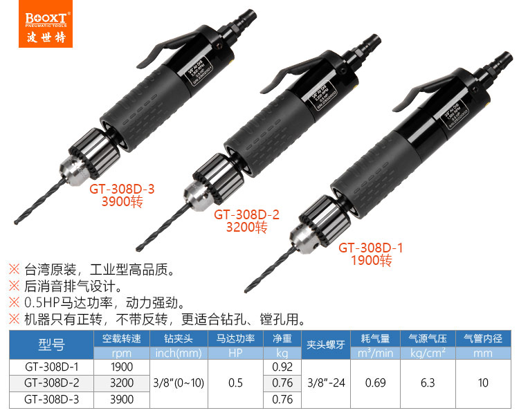 東莞市強(qiáng)勁五金工具有限公司提供臺(tái)灣BOOXT波世特品牌氣動(dòng)工具,直柄氣鉆GT-308D-2廠家直銷,首件享特價(jià)。咨詢熱線:4008301980