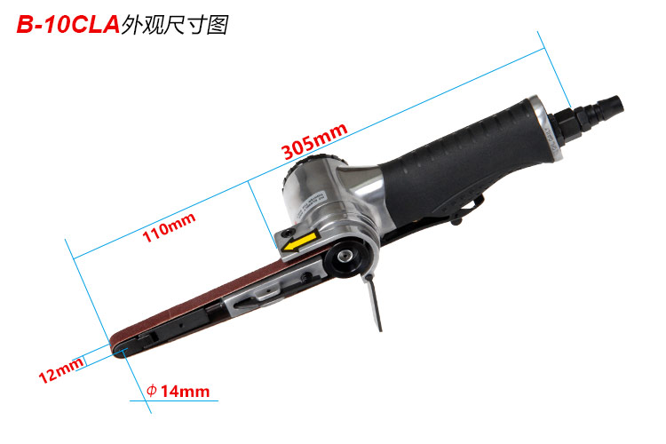 • 產(chǎn)品參數(shù): 砂帶尺寸:10×330mm; 馬達功率:0.5hp 空載轉(zhuǎn)速:20000rpm; 工具長度:305mm; 工具重量:0.84kg; 耗 氣 量:0.15m3/min; 使用工作氣壓:0.65Mpa; 推薦使用內(nèi)徑8mm氣管; 平時使用應多加氣動油保養(yǎng). 【工業(yè)型/下開關(guān)】