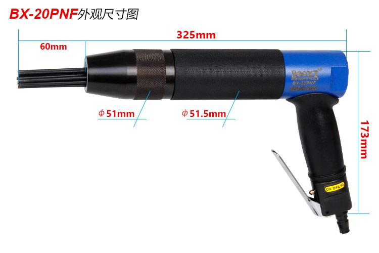 • 產(chǎn)品參數(shù): 沖擊頻率:3700bpm 活塞尺寸:23.6*77.8mm 活塞行程:11mm 除銹針尺寸:M3*180mm 除銹針數(shù)量:19pcs 耗 氣 量:0.28m3/min 全 長:325mm 凈 重:2.64kg 噪 音 值:98.5db(A) 【工業(yè)型/減震型】