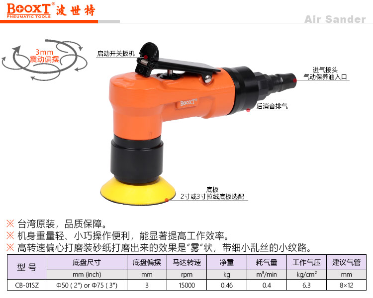 東莞強勁五金工具有限公司提供臺灣BOOXT波世特氣動工具,氣動偏心打磨機CB-01SZ廠家直銷,首件享特價。咨詢熱線:4008301980